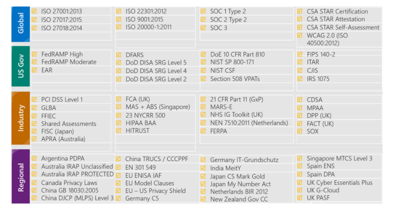 - 다음 이미지는 Azure에서 사용할 수 있는 유명한 규정 준수 제안 중 일부를 보여주지만 이 외에도 많은 규정 준수 제안이 있습니다. 이러한 제안은 글로벌, 미국 정부, 산업, 지역 등 4가지 범주로 그룹화됩니다.
