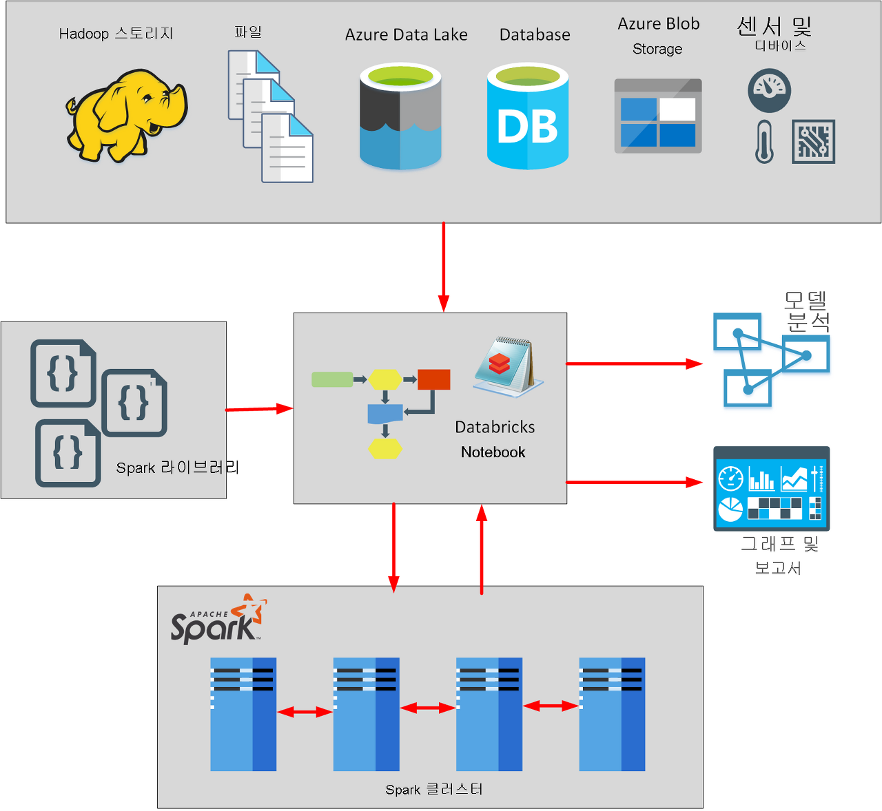 - Databricks는 Azure Blob 스토리지, Azure Data Lake Store, Hadoop 스토리지, 플랫 파일, 데이터베이스 및 데이터 웨어하우스를 포함하여 다양한 유형의 스토리지에 저장된 데이터를 처리할 수 있습니다.