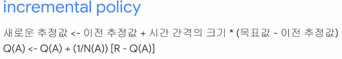 Q(A)<-Q(A) + alpha[ R - Q(A) ] // 가치 update