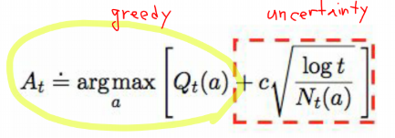 이 식의 의미는 greedy 하게 선택하되, 선택이 안 된 후보 군들 중에 더 좋은 가능성이 있는 애가 있을 수 있으므로 선택될 기회를 주는 것이다. 후보를 오랫동안 선택하지 않으면 가중치가 높아지게 된다.